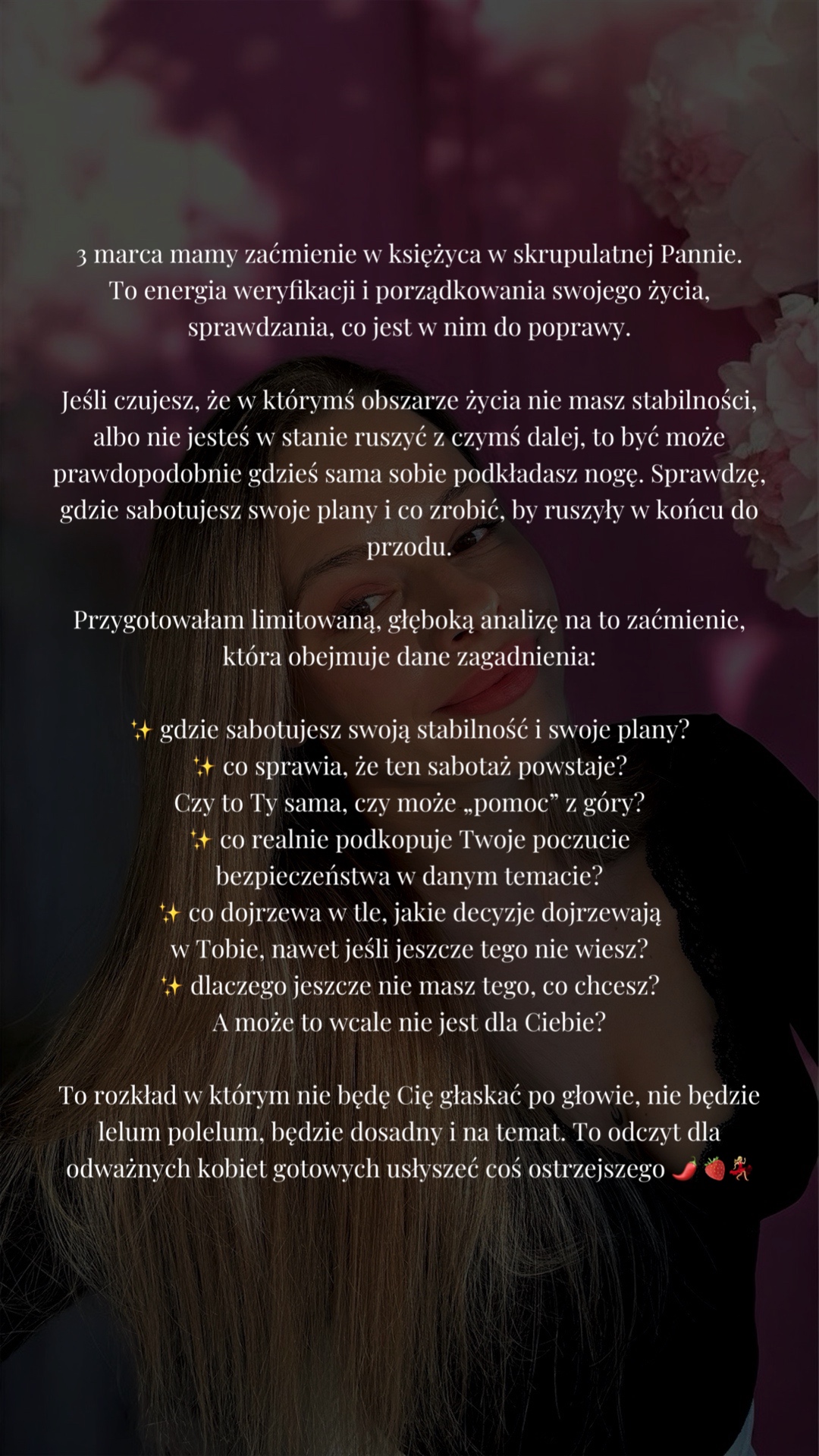 To rozkład w którym nie będę Cię głaskać po głowie, nie będzie lelum polelum, będzie dosadny i na temat. To odczyt dla odważnych kobiet gotowych usłyszeć coś ostrzejszego 🌶️ 🍓💃🏼